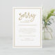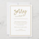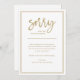 Diese einfache und elegante Ankündigung ist eine Möglichkeit, sich bei Kunden oder Freunden zu entschuldigen, wenn Sie eine Veranstaltung oder Hochzeit absagen, umplanen oder verschieben müssen. Moderne, Imitate Gold-Look handgeschriebene Skript fügt eine stilvolle Touch, während der rechteckige Goldrahmen fügt ein formales und klassisches Aussehen. Verwenden Sie diese Ankündigungskarten für jede Stornierung, Verschiebung oder Umschuldung.