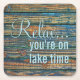 Schöne zeitgenössische aquamarine türkisfarbene und braune Holzplanken bilden ein Muster. Mit 'Relax you are on lake time' Textziffer. Originelle Dekoration Akzente für die Dekoration Ihres Master- oder Kinderschlafzimmers, Küche, Wohn- oder Familienzimmer, Uni-Stube, Apartment oder Studio, Berghütte Zuhause, Land-Hütte, Login, Angellager, RV oder Camper, Schiff oder Yacht, See oder Fluss Urlaub Zuhause.