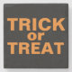 Für diejenigen, die nicht viel Aufregung oder Schnörkel mögen, bietet dieser Untersetzer ein einfaches Design mit Schrift. Dieser Halloween-Untersetzer hat einen schwarzen Hintergrund. In orange füllen die Worte "TRICK oder TREAT" den Raum.