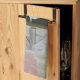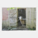 Diese Küche oder Geschirrtuch kennzeichnet ein süßes leichtes Schaf, das im Eingang zu seinem Zuhause in Connecticut stehend ist.