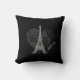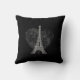 Entzückendes Kissen mit dem Eiffelturm und dem grauen Text: PARIS auf schwarzem Hintergrund.