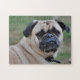 Entzückender Mops mit einem Stück des Puzzle
