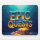 Ein lebendiges Aquarellbild mit dem Satz "Epische Quests" in einer kühlen, künstlerischen Schrift. Die Briefe sind mit goldenen Akzenten geschmückt und von einer Schatztruhe umgeben, die mit Juwelen und Goldmünzen überflutet ist. Der Hintergrund ist tiefblau und erinnert an die Tiefe des Ozeans, was das Gefühl von Abenteuer und Schatzsuche noch verstärkt.