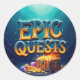 Ein lebendiges Aquarellbild mit dem Satz "Epische Quests" in einer kühlen, künstlerischen Schrift. Die Briefe sind mit goldenen Akzenten geschmückt und von einer Schatztruhe umgeben, die mit Juwelen und Goldmünzen überflutet ist. Der Hintergrund ist tiefblau und erinnert an die Tiefe des Ozeans, was das Gefühl von Abenteuer und Schatzsuche noch verstärkt.