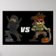 Schwarzes Poster mit einem Gesicht von Piraten und Ninjas. Es gibt einen schwarzen Cartoon Ninja, der zwei braune Katanen in den Schädeln hat, seine Arme überquert und auf einem Felsen stehend ist. Es gibt auch einen Cartoon-Piraten, der eine graue Schnittblase hat, ein Augenpflaster, ein Bein, einen Haken, eine Tätowierung, die Mama sagt, einen braunen Hut, einen Stiefel, einen grünen Knopf oben Shirt, eine Khaki Hose, ein Rot mit weißen Flecken Bandana, einen Gürtel mit goldenen Schnürtel und Ohrringe stehend auf einer Schatztruhe.