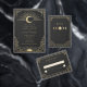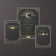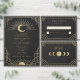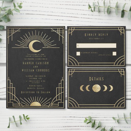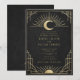 An elegant Art Deco wedding invitation featuring radiant gold celestial motifs — perfect for moonlit ceremonies, solstice celebrations, or timeless evening affairs. Please note: gold is a printed color, not metallic or foil.