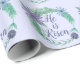 Er ist Risen. Schöne religiöse Schrift Osterpackende Party Papier mit einem wunderschönen Blumenkranz von lila und grün auf einem pastellfarbenen Hintergrund für ein Christliches Geschenk.