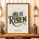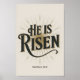 Eine Christliche Typografie im Vintagen Stil mit der Phrase "He is Risen" in einem kühnen, serifenlosen Schriftart mit eleganten Schnörkeln. Hinter dem Text verbirgt sich ein subtiles Vintages Kreuz oder ein Sonnenbrand, dessen sanfte Lichtstrahlen nach außen strömen. Die Farbpalette umfasst reiche Golden, Cremes und abgedämpfte Erdtöne.