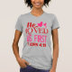 "Er liebte uns zuerst" (1 John 4:19). Roter und rosa Text mit Herz verziert. Wählen Sie Ihre Lieblings-Shirt-Farbe und Stil, um es zu Ihrem eigenen zu machen.