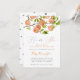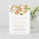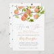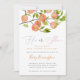Rustikales pfirsiches Thema Geschlecht zeigen eine Party Einladung-Karte mit der Abbildung der Gartenfrucht auf einem Baumzweig. Ideal für ein Party im Sommer. Im Text steht: "Was wird unser kleiner Pfirsich sein?"