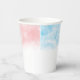 Diese Gender-Enthüllung Party Papier Becher zeigt Gold Imitat Glitzer Kalligraphie Text "er oder sie" auf einem rosa und blauen Aquarellhintergrund.