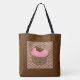 Bedruckte Tasche - Erdbeere Rosa Mattierter Kuchen mit einem Schokoladenschmetterling überzogen in einem dekorativen, schokoladenbraunen Damast gemusterten Kuchenwickler auf braunem, braunem und korallenrosa chinesischem Hintergrund