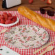 Boho Blumenplatte, perfekt für Frühlings-Party, Sommer-Party, Babyduschen und Hochzeiten im Hinterhof. Ideal, um einen farbigen Pop in den Sommerquartieren hinzuzufügen. Papierplatte mit Erdbeerblumenmuster. Passen Sie die Musterskala an, und fügen Sie dem Ereignis personalisierten Schriftart oder Text hinzu. Set in Rosa, Rot, Grün, Beige/Creme.