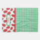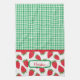Freuen Sie sich auf ein buntes Küchentuch mit einem grünen und weißen Gingham-Karo, der kariert mit einem Erdbeermuster unten ist. Ein rotes Farbband in Imitaten trennt die beiden Muster. Unten befindet sich ein Ort, an dem Sie das Handtuch persönlich gestalten können.