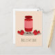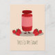 Postkarte mit einem lächelnden Glas Erdbeermarmelade. Diese Cartoonillustration hat Erdbeeren auf beiden Seiten. Unterhalb des Zeichnens sind die Wörter, ", das dieses mein Stau! ist". Die Wörter können besonders angefertigt werden.