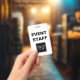 Identifikations-Abzeichen Personal des speziellen Ereignisses, die eine Logoschablone Sie umfassen, können durch Ihre Firma oder Ereignislogo und -graphik ersetzen. Entworfen für Unternehmens-, Party, Konzert oder Versammlungspersonal und -sicherheit.