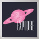 Eine niedliche Abbildung des Saturns in Rosa auf marinischem Hintergrund mit dem Wort Erforschen in einem lustigen großen Schriftart.