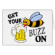 Niedliche Biene, die an einer eiskalten schaumigen Tasse Bier leckt und hofft, sein Summen an zu erhalten! Und Sie sollten auch!