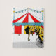 Circus Elephant reitet Fahrrad mit rotem und weißem Zirkuszelt
