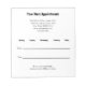 Auf diesem Notizblock steht oben "Ihr nächster Termin". Die Zeilen schwarzer Bildschirmtexte sind für den Namen der Arztpraxis, die Straßenadresse, die Telefonnummer und die Website verfügbar. Es gibt auch Zeilen für Datum und Uhrzeit der Bestellung. Im unteren Bereich befindet sich der Text, den Sie bearbeiten können, um eine benutzerdefinierte Nachricht zu zeigen. Alle Texte können bearbeitet oder gelöscht werden.