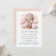Die Babydusche "Lass the Adventure Begin" lädt mit einem zauberhaften, orangefarbenen Kätzchen ein, das einen Teddybär auf einer Fahrt mit einem Heißluftballon in rosa Wolken und umliegenden goldenen Sternen in blindrosa Aquarellfarben hält. Weiße Sternmuster auf rot rosa auf der Rückseite des Einladens. Vorlagen.