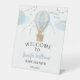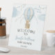 Elegantes Abenteuer erwartet die Gäste mit einem Babyduschenduschenschild, auf dem niedlicher Teddybär mit blauem Heißluftballon gezeigt wird.