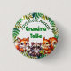 Abenteuer erwartet. Oma zu Baby-Duschknopf mit einem Woodland Creatures Thema mit niedlichem Waschbär, Eichhörnchen und Fuchs in einem niedlichen Cartoon-Stil, umgeben von magischen Wäldern und Farn-Blattwerk.