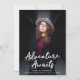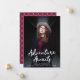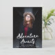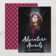 Trendy Graduierungsankündigungen mit dem senkrechten Foto des Absolventen mit "Adventure Awaits" in weißer, handgeschriebener Schrift. Personalisieren Sie die Front der Abenteuer Awartet Graduierungsankündigungen, indem Sie den Namen des Absolventen, den Namen der Schule und das Abschluss Jahr. Die Ankündigung kehrt zurück, um ein elegantes bordeauxfarbenes und weißes Trellis-Muster zu zeigen.