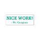 Dieses motivierende Gummi Briefmarke Design zeichnet sich durch die positive Botschaft "NICE WORK!" und den Namen eines individuellen Lehrers aus. Es könnte von einem Lehrer, Pädagogen oder Tutor genutzt werden, um anzuerkennen, dass ein Schüler eine außergewöhnliche Arbeit geleistet hat.
