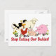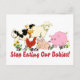 Eine Kuh, Schafe, Schweine, Kaninchen und ein Huhn sagen: "Hört auf, unsere Babys zu essen!" Eine schöne Art, Fleischesser daran zu erinnern, dass sie jemandes Kinder essen.
