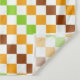 Ein lebhaftes Schachbrettmuster aus wechselnden grünen, orangen und braunen Quadraten auf weißem Hintergrund. Das Design erzeugt ein lebendiges, geometrisches Gefühl.