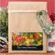 Ein farbenprächtiger Erntezeitaufkleber mit Obst und Gemüse, Blume und Blätter von einem Holzzaun, fügen Sie den Text Ihrer Wahl.