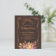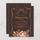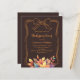 Ein bistre, dunkelbrauner Hintergrund. Dekoriert mit farbigen Herbstlauben und einem handgezeichnet Bogen. Personalisieren Sie die Party-Details und fügen Sie sie hinzu. 1 Blatt = 1 Einladung mit Druckkante bis Kante.