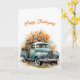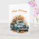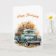 Das Bild ist eine digitale Illustration eines Vintagen blauen Lieferwagen-Trucks. Der LKW ist mit einer Reihe von herbstbezogenen Artikeln wie Kürbissen, Gourds und bunten Herbstlauben geschmückt. Das Design und der Stil des LKW, die lebhaften Farben und die festliche Dekoration verleihen ihm ein nostalgisches und saisonales Ambiente, das an die Erntezeit oder ein Herbstfest erinnert.