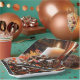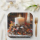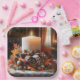 Eine weiße Kerze ist von Kiefernkonen, Eicheln und farbenfrohen Blätter umgeben