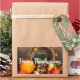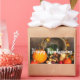 Aufkleber mit Foto einer Erntedank Ernte, Set auf einem rustikalen Holztisch. Kürbis, Kartoffeln, Squash usw... bilden diese reiche Sammlung von Lebensmitteln. Farbige Herbstblätter umschließen den Kornukokia-Korb.