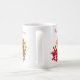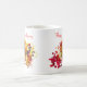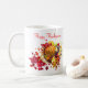 Kaffee-Tasse mit meinem digitalen Kunstwerk einer fröhlichen und farbenfrohen Cornucopia gefüllt mit Kürbis, Äpfeln, Orangen, Kiefern, Trauben, Mais und roten Herbstblättern. Im Text steht "Glückliches Erntedankfest".