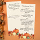 Cremefarbener Hintergrund mit Blume und Kürbis in Orangetönen. Personalisieren Sie Ihre Erntedank-Menüs auf der Vorderseite und fügen Sie sie hinzu. Zurück: Platz für Sie, um Ihrem Gast eine dankbare Nachricht hinzuzufügen. Und ein Bereich für die Gäste, um ihre Begeisterung zu teilen.