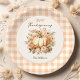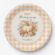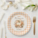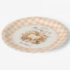Erntedank Dinner Paper Teller in elegantem, modernem Bauernstil, mit Blumenkürbis und Gingham in sanften Orange, Creme und Grün auf dem cremefarbenen Hintergrund. Personalisieren Sie den Text einfach. Kate Eden Art