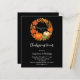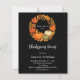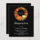 Ein schwarzer Hintergrund. Dekoriert mit einem Kranz im Untergang, Orangenblättern und Kürbissen. . Mit dem Text: Erntedank Dinner geschrieben mit einem modernen handgeschriebenen Stil Skript. Personalisieren und fügen Sie die Details hinzu. 1 Blatt = 1 Einladung mit Druckkante bis Kante.
