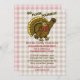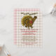 Der Hintergrund ist hellbrauner Gingham und der Text ist rot und braun. Die Rückseite der Einladung hat hellroten Gingham.
