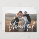 Moderne Erntedank-Fotokarte mit dem Wort "Dankbar" in einem weißen, handgeschriebenen Script-Overlay. Personalisieren Sie die Vorderseite der Karte, indem Sie Ihr gesamtes, horizontales Foto, Ihren Namen und das Jahr hinzufügen. Die niedliche Erntedank-Karte zeichnet sich durch ein weißes Blattmuster und einen soliden braunen Hintergrund (oder eine Farbe Ihrer Wahl) aus.