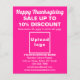 Alles Gute zum Erntedankfest! Feiertag in diesem November zu feiern, um für die Segnungen, die wir erhalten danken. Es ist auch einer der Feiertage, um für Ihr Unternehmen zu werben. Individueller Flyer mit Erntedank-Verkauf, Ihr Firmenname und andere Informationen über Ihr Unternehmen, ein Marketing-Material, das Sie verwenden können, um mehr Kunden anzuziehen. Passen Sie es an und vertreiben Sie es, um mehr Kunden zu gewinnen, Ihre Produkte oder Kunden zu kaufen, um Ihre Dienste zu mögen. Designfarben sind weiße Texte auf rosa Hintergrund. Um diesen Flyer anzupassen, geben Sie den prozentualen Rabatt an, den Sie anbieten und den Verkaufstermin. Laden Sie auch Ihr Firmenlogo hoch, geben Sie Ihren Firmennamen, Ihre Adresse, Telefonnummer, E-Mail und Website oder Ihre Social Media-Seite ein. Bitte Karo nach der Texteingabe und dem Hochladen des Logos auf der Vorder- und Rückseite. Wenn Ihnen das Aussehen gefällt, können Sie jetzt Ihre Bestellung aufgeben. Wenn Sie die Größe des Textes und des Logos ändern und verschieben müssen, um auf diesen Flyer oder auf die gewünschte Größe zu passen, ändern Sie bitte das Design-Tool. Sie können auch die Hintergrundfarbe, die Farbe des Schriftartes und den Stil des Schriftartes im Designwerkzeug ändern. Alles Gute zum Erntedankfest! Wir wünschen Ihnen mehr Umsatz in diesem Urlaub.