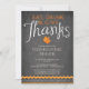 Modernes Set für Essen, Trinken & Give dank Typografie auf beliebtem Holzkohleboden mit orangefarbenem Blatt und hübschem blüh. Dreh unsere Einladung zum Erntedank Dinner, um einen passenden Rücken für eine besondere Touch zu sehen. Schöne und einzigartige Einladung für Ihren Erntedank Tag feiern.