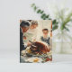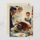 Dieses Bild zeigt eine klassische Erntedank-Szene, die an Vintage Illustrationen erinnert. Es verfügt über eine Familie, die sich um einen Esstisch versammelt und sich dabei glücklich ansieht, wie ein älterer Mann einen großen, goldbraunen, gerösteten Truthahn schneidet. Das warme Licht, das durch das Fenster strömt, beleuchtet die Gesichter der Familienmitglieder und unterstreicht deren Glück und Vorfreude. Der Tisch ist elegant mit einem reichhaltigen Fest, Weintrauben und dekorativen Gärten rund um den Truthahn, Set. Das Ambiente erinnert an Nostalgie, Wärme und Feiern.