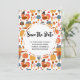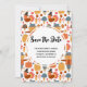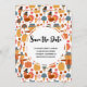 Save the Date Karte mit saisonalen Fallmuster, Mais, Pilze und Flora. Zusammen mit Truthühnern und Skarecrows, um die Tradition des Erntedanks zu ehren.