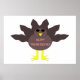Dieses Poster enthält einen Cartoon eines Truthühners mit großen schwarzen Augen, einen kleinen gelben Schnabel und Schwanz Federn, die aufhängen. Die Füße stehen in entgegengesetzter Richtung, was den Truthahn goofy erscheinen lässt. Der Truthahn hat einen rosa Text auf seinem Bauch, der "Glückliches Erntedankfest" sagt und es sieht so aus, als wären die Federn ausgepeitscht worden, um die Botschaft zu verraten.
