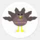 Dieses Aufkleber-Blatt weist einen Cartoon eines Truthahns mit großen schwarzen Augen, einen kleinen gelben Schnabel und Schwanz-Federn auf. Die Füße stehen in entgegengesetzter Richtung, was den Truthahn goofy erscheinen lässt. Der Truthahn hat einen rosa Text auf seinem Bauch, der "Glückliches Erntedankfest" sagt und es sieht so aus, als wären die Federn ausgepeitscht worden, um die Botschaft zu verraten.