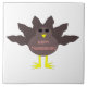 Diese phantastische Kachel hat einen Cartoon eines Truthahns mit großen schwarzen Augen, einen kleinen gelben Schnabel und Schwanz Federn, die aufklemmen. Die Füße stehen in entgegengesetzter Richtung, was den Truthahn goofy erscheinen lässt. Der Truthahn hat einen rosa Text auf seinem Bauch, der "Glückliches Erntedankfest" sagt und es sieht so aus, als wären die Federn ausgepeitscht worden, um die Botschaft zu verraten.