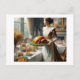 Eine in Vintager Kleidung gekleidete Frau trägt eine Platte mit einem gerösteten Truthahn, die bereit ist, sie auf einem schön arrangierten Esstisch Set. Der Raum ist elegant mit Blumenarrangements, Kerzen und natürlichem Licht gestaltet, das durch große Fenster hereinströmt.